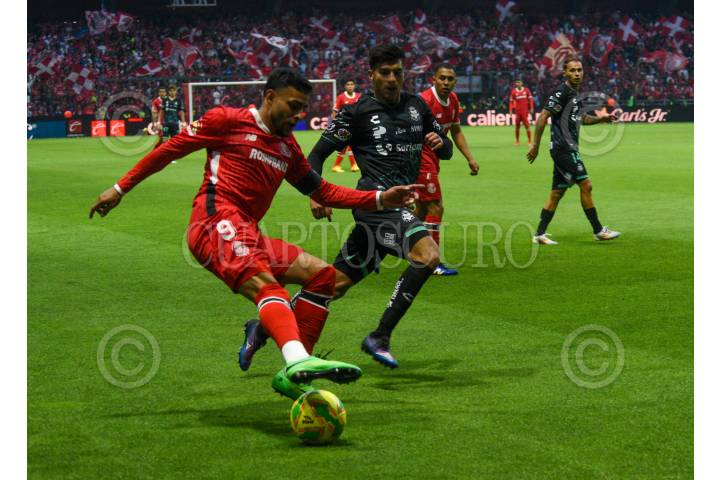 TOLUCA, ESTADO DE MÉXICO, 06ABRIL2025.- Juan Domínguez medio de los Diablos de Toluca y pelea el esférico ante un jugador de la escuadra de Santos, en el partido correspondiente a la jornada 14 del Torneo Clausura de la Liga MX, el encuentro culminó con un marcador 2-1. FOTO: CRISANTA ESPINOSA AGUILAR /CUARTOSCURO.COM