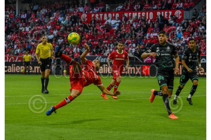 TOLUCA, ESTADO DE MÉXICO, 06ABRIL2025.- Alexis Vega delantero de los Diablos de Toluca y Ramiro Sordo medio de la escuadra de Santos, en el partido correspondiente a la jornada 14 del Torneo Clausura de la Liga MX, el encuentro culminó con un marcador 2-1. FOTO: CRISANTA ESPINOSA AGUILAR /CUARTOSCURO.COM