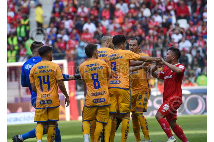 TOLUCA, ESTADO DE MÉXICO, 02MARZO2024.- Los jugadores de Los Diablos de Toluca y la escuadra de Tigres tuvieron un conato de bronca en el partido correspondiente a la jornada 10 del Torneo Clausura 2024, en el estadio Nemesio Diez, con un marcador final 2-1. FOTO: CRISANTA ESPINOSA AGUILAR /CUARTOSCURO.COM