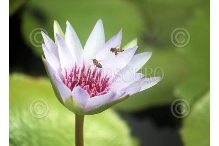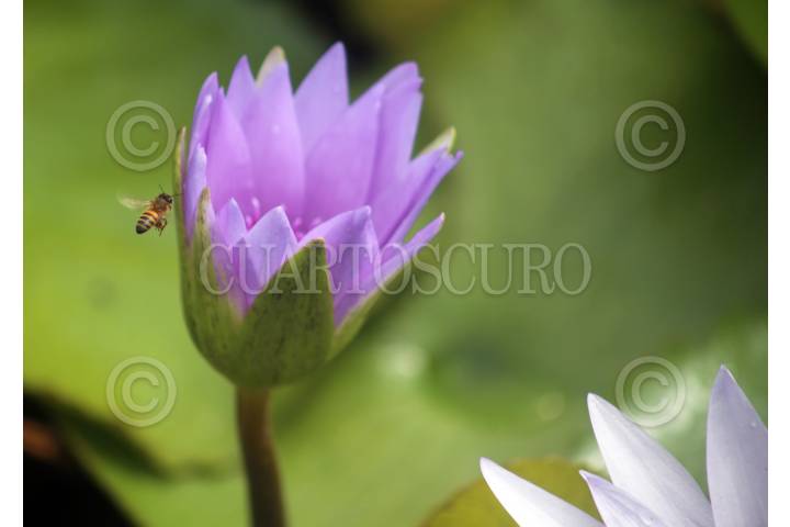 JIUTEPEC, MORELOS, 01JULIO2019. Abejas vuelan sobre un nenúfar de espectacular forma y sutil color en un jardín de este municipio. FOTO: MARGARITO PÉREZ RETANA /CUARTOSCURO.COM
