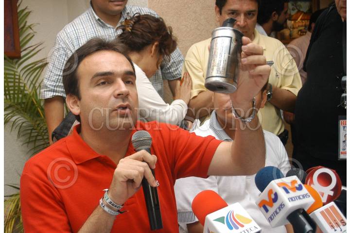 MERÍDA YUCATÁN 19MAYO2007.-Nerio Torres representante local del PRI muestra la lata del gas lagrimogeno que utilizaron los elementos antimotines al momento de rescatar al hermanono del gobernador. FOTO: GUILLERMO PEREA/CUARTOSCURO.COM