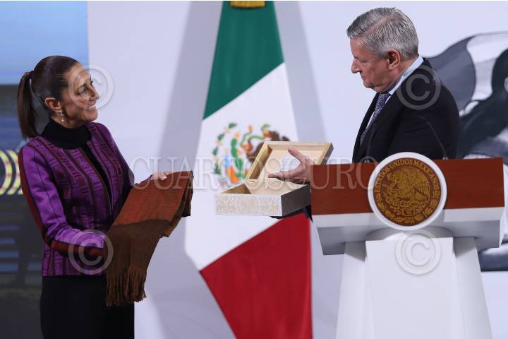 CIUDAD DE MÉXICO, 20FEBRERO2025.- Claudia Sheinbaum, presidenta de México, recibe de manos del CEO de Netflix, Ted Sarandos, un rebozo que fue utilizado en las grabaciones de la película "Pedro Páramo" la cual fue realizada por dicha empresa. FOTO: DANIEL AUGUSTO/ CUARTOSCURO.COM