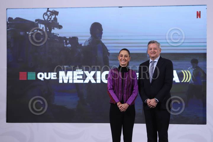 CIUDAD DE MÉXICO, 20FEBRERO2025.- Claudia Sheinbaum, presidenta de México y el CEO de Netflix, Ted Sarandos, anunciaron la inversión que realizará la compañía durante los siguientes cuatro años en México. FOTO: DANIEL AUGUSTO/ CUARTOSCURO.COM