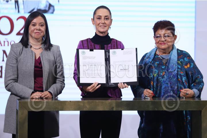 CIUDAD DE MÉXICO, 20FEBRERO2025.- Claudia Sheinbaum, presidenta de México, acompañada de la consejera jurídica de la presidencia, Ernestina Godoy y de Noemí Juárez, subsecretaria de Educación Básica, firmó la iniciativa enviada al Congreso para reformar el artículo 40. FOTO: DANIEL AUGUSTO/ CUARTOSCURO.COM