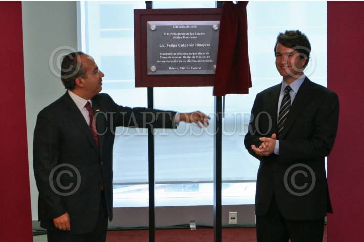 MÉXICO, D.F., 04JULIO2008.- El presidente Felipe Calderón develo la placa de la inauguración de las oficinas corporativas de Nextel en conmemoración de su décimo aniversario al lado del Peter Foyo, presidente y director general de Nextel en la Torre Arcos II en Bosques de las Lomas. FOTO: RODOLFO ANGULO/CUARTOSCURO.COM
