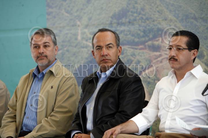 HOSTOTIPAQUILLO, JALISCO, 22ENERO2008.- El gobernador de Jalisco, Emilio González, el presidente Felipe Calderón Hinojosa y el gobernador del estado de Nayarit, Ney González, durante el inicio de obras de la presa "La Yesca". FOTO: ALFREDDO GUERRERO/CUARTOSCURO.COM