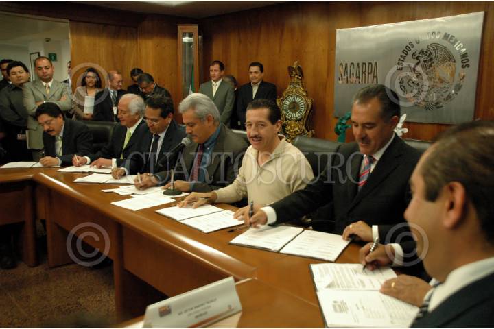 MÉXICO D.F. 23DICIEMBRE2008,- El titular de la SAGARPA Alberto Cardenas junto con 13 gobernadores firmaron este mediodía un convenio para liberar recursos para el campo durante los primeros 6 meses del año. En la imagen El goberador de Oaxaca, Ulises Ruiz, Marcelo de los Santos, gobernador de San Luis, Hector ortiz Ortiz, gobernador de Tlaxcala,, Alberto Cardenas, Titular de la Sagarpa, Ney Gonzalez, gobernador de Nayarit, y Marco Adame Castillo gobernador de Morelos. FOTO: SAÚL LÓPEZ/CUARTOSCURO.COM