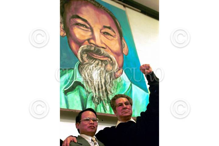 Miembros de Consejo General de Huelga, debelararon el retrato de Ho Chi Minh del pintor Mario Falcón que fue destruido por la PFP en febrero pasado en la Facultad de Economía, al evento fue invitado el Embajador de Vietnam, Nguyen Van Sanh (izq). FOTO: Eduardo Loza/CUARTOSCURO.COM