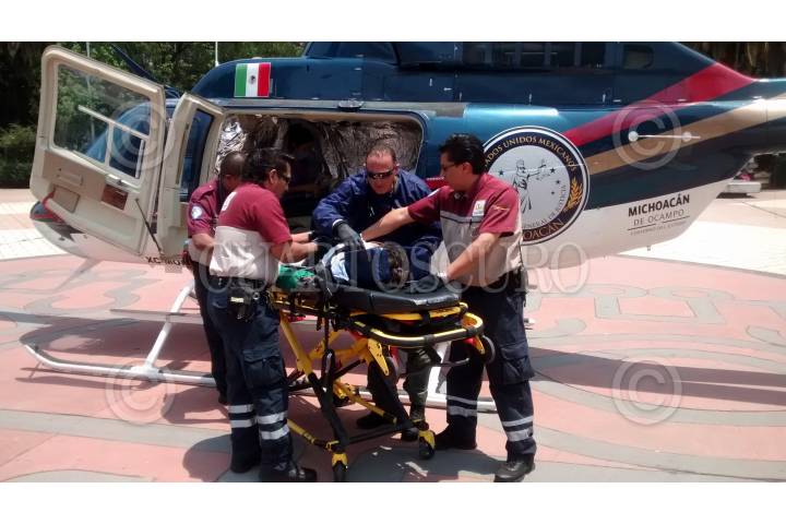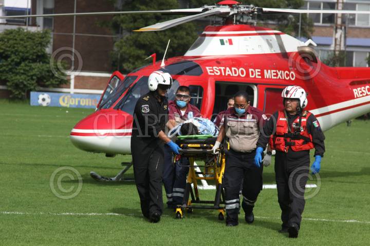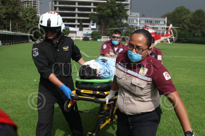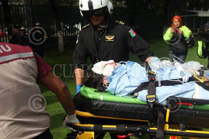 MÉXICO, D.F., 10ABRIL2015.- Una niña de 4 años de edad fue trasladada en un helicóptero del municipio de Zitacuaro, hacia el deportivo Xochimilco, donde la esperaba una ambulancia para llevarla al hospital pediátrico infantil de Xochimilco, la menor sufrió lesiones de quemadura tras caerle agua hirviendo en parte de su cuerpo. FOTO: SAÚL LÓPEZ /CUARTOSCURO.COM