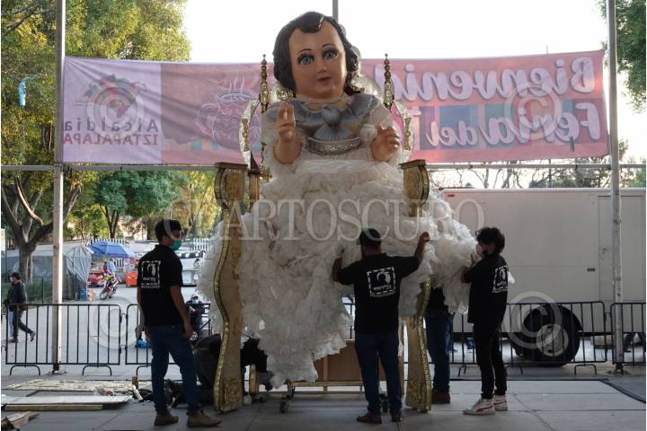 Previo a la celebración del Día de la Candelaria, integrantes del Taller Morphix Group, colocaron el Niño Dios más grande, conocido como el "Niño Dios de la Paz y el Bien" en la explanada de la Macroplaza de la alcaldía Iztapalapa