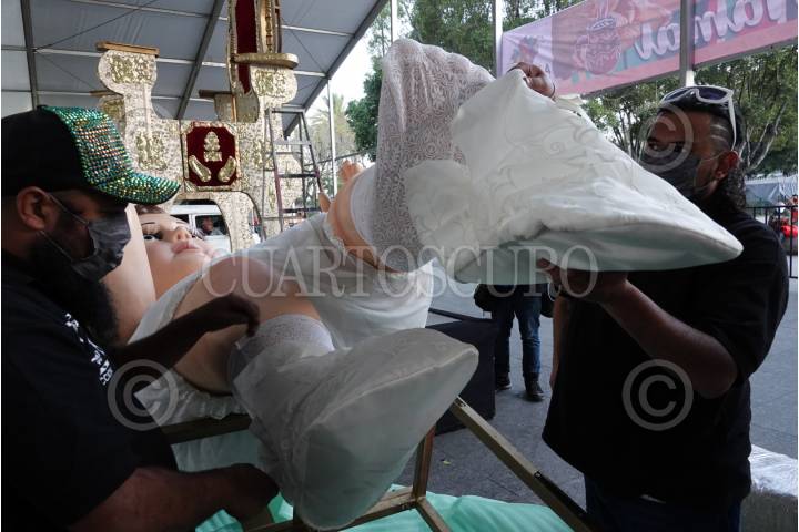 Previo a la celebración del Día de la Candelaria, integrantes del Taller Morphix Group, vistieron al Niño Dios más grande, conocido como el "Niño Dios de la Paz y el Bien" en la explanada de la Macroplaza de la alcaldía Iztapalapa