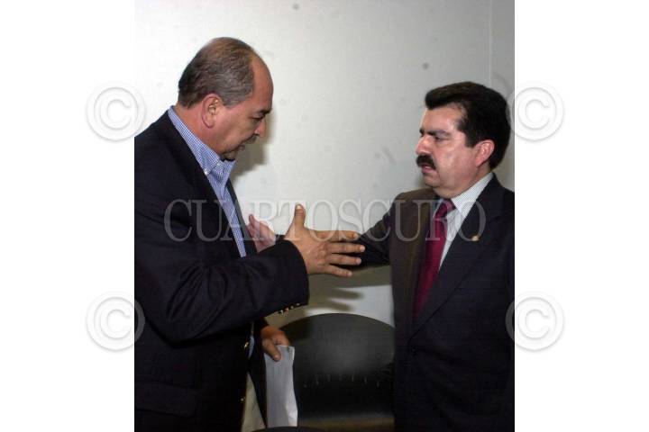 El perredista Juan Nicasio Guerra se despide del subsecretario de Gobierno, Ramón Martín Huerta, durante la mesa política para vigilar las elecciones del domingo. Aesta reunión no asistieron representantes del PRI y el PT. FOTO: Juan Pablo Zamora/CUARTOSCURO.COM
