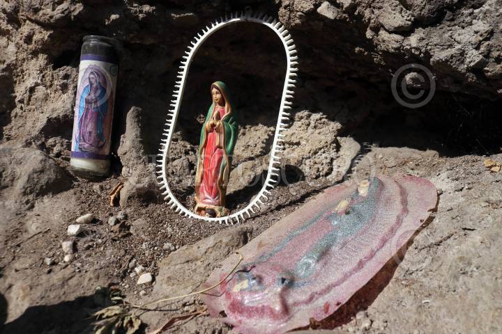 Tres figuras de la Virgen de Guadalupe rescatadas de la basura adornan un pequeño nicho a lado de un camino.