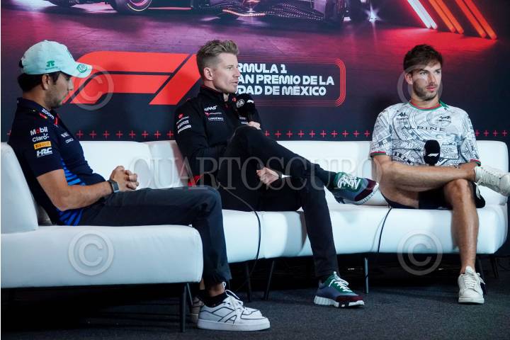 CIUDAD DE MÉXICO, 24OCTUBRE2024.- Los pilotos Sergio “Checo” Pérez (Oracle Red Bull Racing), Nico Hulkenberg (MoneyGram Haas) y Pierre Gasly (BWT Alpine) durante la conferencia de pilotos en el marco del primer día de actividad del Gran Premio de la Ciudad de México que se celebra en el Autódromo Hermanos Rodríguez. FOTO: GALO CAÑAS/CUARTOSCURO.COM