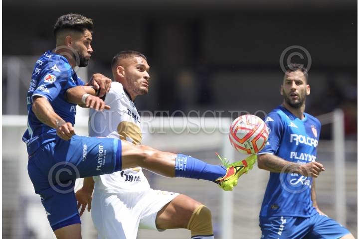 José Angulo y Kevin Balanta de Querétaro disputan un balón a Nicolás Freiré de Pumas durante el partido de fútbol Pumas vs Querétaro correspondiente a la jornada 13 del Torneo Apertura 2022 de Liga BBVA MX, en el estadio Olímpico Universitario.