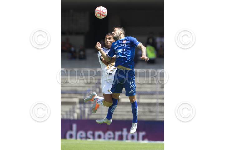 Nicolás Freire de Pumas y Edgar Méndez de Necaxa disputan una pelota durante el partido de fútbol Pumas vs Necaxa correspondiente a la jornada 3 del Torneo Apertura 2022 de Liga BBVA MX, en el estadio Olímpico Universitario.