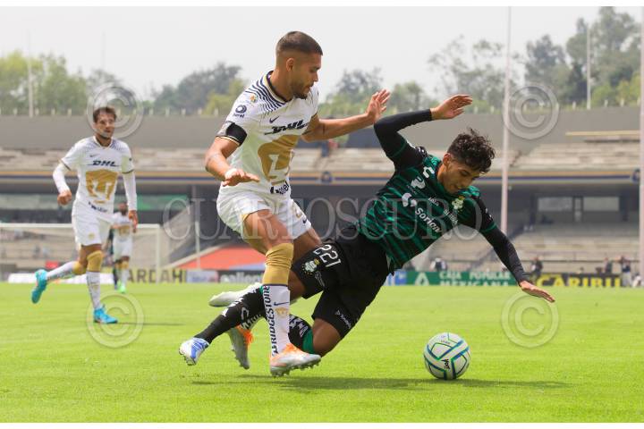 Jaír González de Santos y Nicolás Freire de Pumas durante el partido de fútbol Pumas vs Santos correspondiente a la jornada 10 del Torneo Apertura 2022 de Liga BBVA MX, en el estadio Olímpico Universitario.