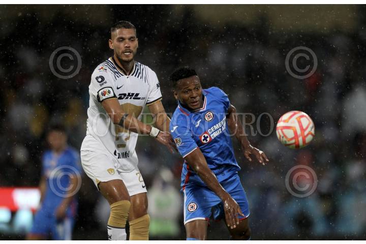 Nicolás Freire de Pumas Y Michael Estrada de Cruz Azul disputan un balón durante el partido de fútbol Pumas vs Cruz Azul correspondiente a la jornada 15 del Torneo Apertura 2022 de Liga BBVA MX, en el estadio Olímpico Universitario.