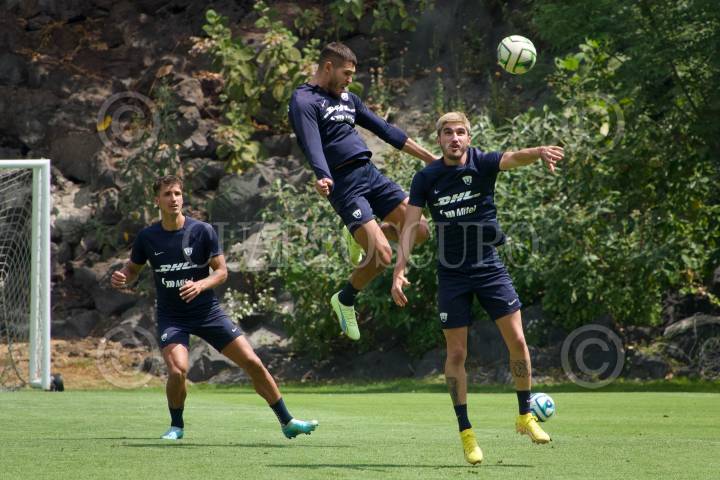 Juan Dinenno, Adrian Del Petre y Nicolás Freire, durante el entrenamiento del equipo Pumas en cantera.