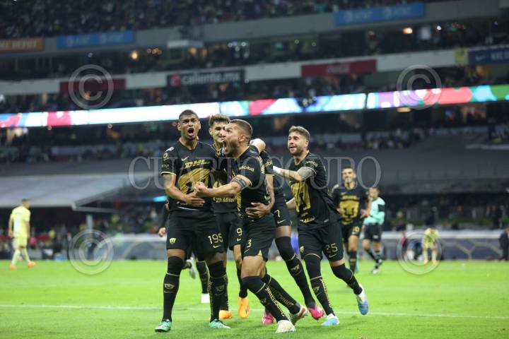 Nicolás Freire de los Pumas celebra la anotación ante América, en el Estadio Azteca.