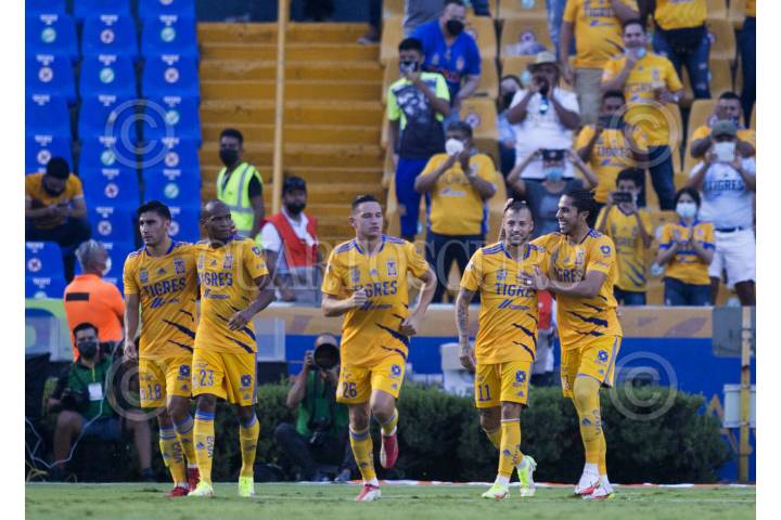 Jugadores del equipo de los Tigres de la UANL, celebran el gol de Nicolás López, ante el equipo del Atlas, en el estadio Universitario, partido correspondiente a la jornada 7 de la Liga Mx, Apertura 2021. Marcador Final: Tigres: 1 - Atlas: 1