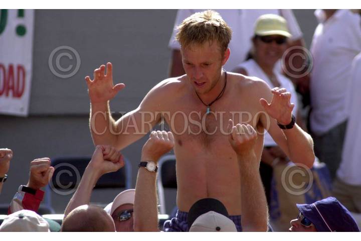 El equipo de tenis de Canadá festeja el triunfo de Frederic Niemeyer ante Miguel Gallardo en el último juego y definitivo de la Copa Davis 2001. FOTO: David Bolaños/CUARTOSCURO.COM