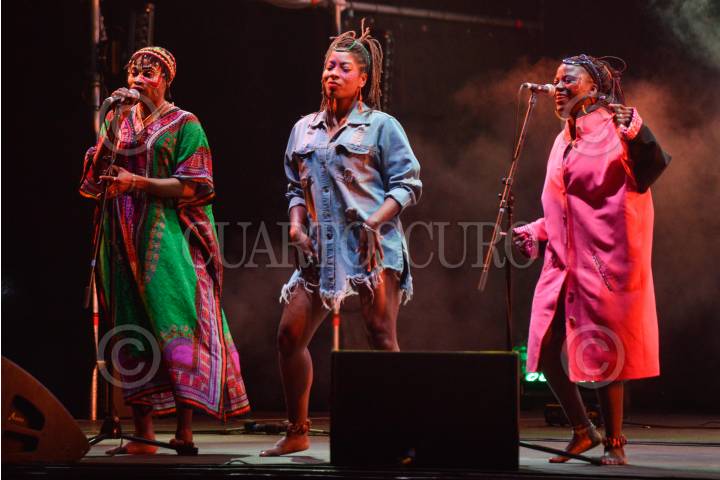 Bailarinas durante el concierto de Seun Kuti, cantautor nigeriano e hijo de Fela Kuti (1938-1997) precursor del género afrobeat, en la Alhóndiga de Granaditas como parte del 50 Festival Internacional Cervantino (FIC).