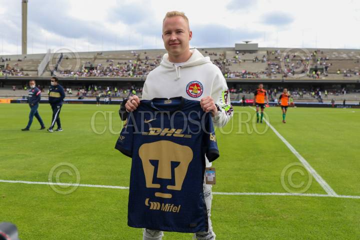 Nikita Mazepin, corredor de Haas F1, posa con la playera de los Pumas, previo al encuentro que los universitarios sostuvieron con Juárez, en el Estadio Olímpico Universitario.