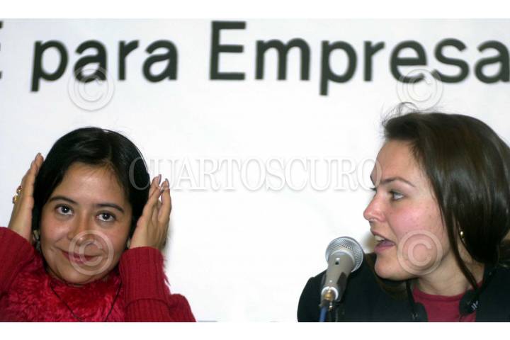 Miroslava García, representante de la comisión de Comercio y Fomento Industrial en San Lázaro, y durante su participación en el seminario "Directrices de la OCDE para Empresas Multinacionales". En la foto le acompaña la moderadora Veronica Nilson. FOTO: Juan Pablo Zamora/CUARTOSCURO.COM