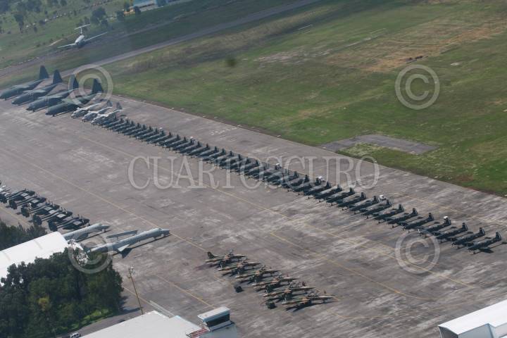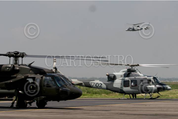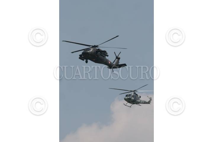 11SEPTIEMBRE2008.-Elementos de la Fuerza Aérea Mexicana y Armada de México, realizaron practicas de preparación en la Base Aeréa No.1 de Santa Lucía, esto por su próxima participación en el desfile militar del 16 de Septiembre con el que se conmemora el 198 Aniversario del inicio de la Independencia Nacional. En el desfile participaran con Helicópteros de los modelos MI-17, UH-60, CH-53, MD-530F y con los aviones, Hercules C-130, F-5 E/7, Pilatus PC-/7 y Arava 101A. FOTO: GUILLERMO PEREA/CUARTOSCURO.COM