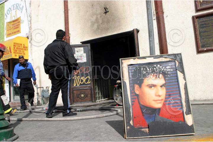 Cd. Juarez, Chihuahua 17 Febrero 2004.- A las afueras del centro nocturno "Noa Noa", se ve a medio consumir el retrato del cantante Juan Gabriel. Un incendio consumio por completo el centro nocturno que inmortalizo en una cancion del compositor. FOTO:JGuadalupe Perez/CUARTOSCURO.COM