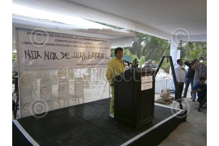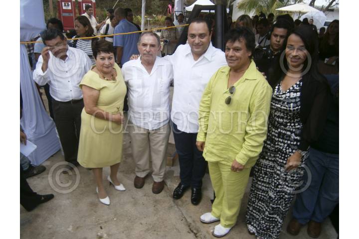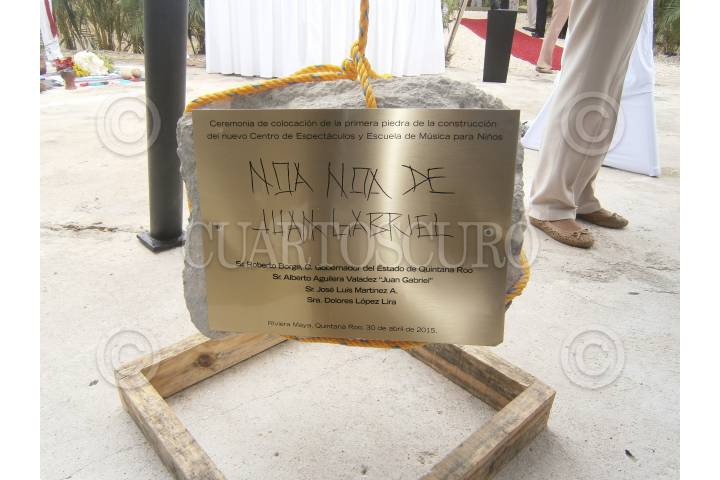 CANCÚN, QUINTANA ROO, 30ABRIL2015.- El Gobernador del Estado de Quintana Roo, Roberto Borge Angulo y el afamado cantautor mexicano Juan Gabriel colocaron la primera piedra de lo que será el Centro de Espectáculos Noa Noa, que construirá el Grupo Lomas Travel en la Riviera Maya, en honor del Divo de Juárez, y el cual albergará museos de las tradiciones y gastronomía mexicana, una escuela de música para niños y un auditorio para mil 200 espectadores. FOTO: CUARTOSCURO.COM