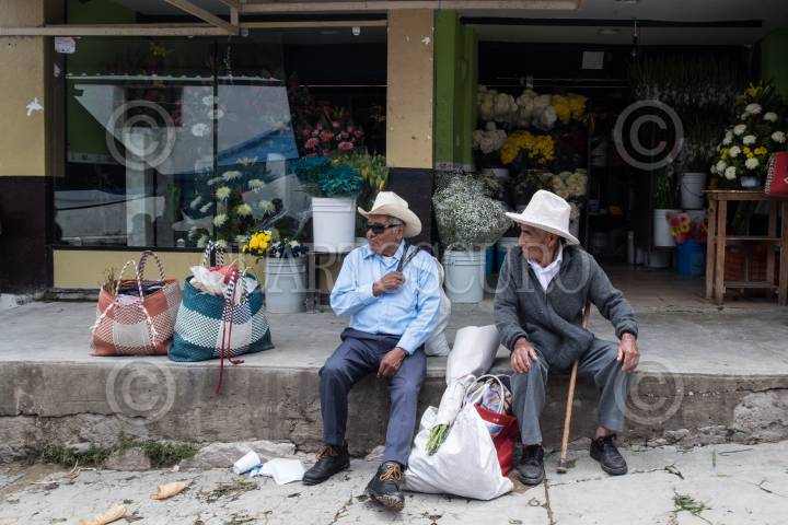 ASUNCIÓN NOCHIXTLÁN, OAXACA, 17JUNIO2018.- Dos hombres platican en la acera frente a una florería en el centro de la ciudad. FOTO: ANDREA MURCIA /CUARTOSCURO.COM