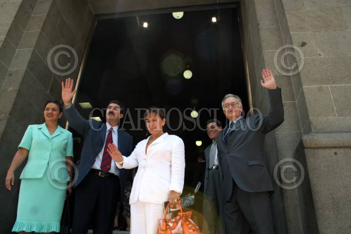 México, D.F. 28 JUNIO 2004.- Los senadores priístas, Noemi Guzman, Yolanda Eugenia González, Joaquin Cisneros, Oscar Cantón y Martha Sofia Tamayo, luego de presentar documentación que prueba relación entre la fundación Vamos México de Marta Sahagún de Fox y Laura Valdes, titular de la Loteria Nacional, en la secretaria de la Funcion Pública. FOTO: Sandra Perdomo/CUARTOSCURO.COM