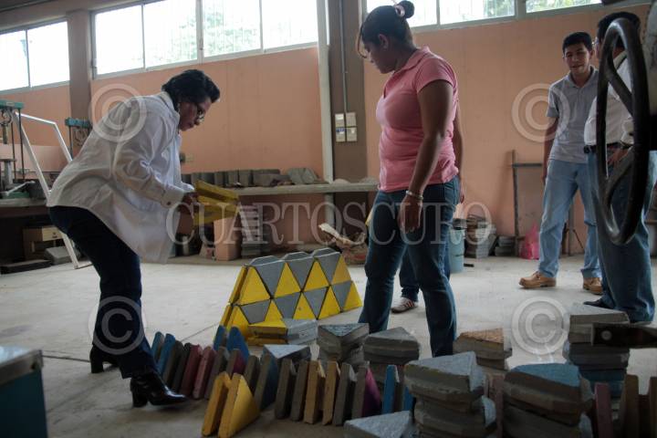 VILLAHERMOSA, TABASCO, 15ENERO2010.- La maestra en Ingeniería y Protección Ambiental e ingeniero Civil, Noemí Méndez de los Santos presento esta tarde en el taller de investigaciones científicas del Instituto Tecnológico de Villahermosa (ITVH) una nueva manera de hacer blocs con escombro lo patento con la forma perfecta de triángulo. El equipo de trabajo conformado por los también investigadores en ingenieria civil e industrial; Carlos Rodriguez Jimenez, Héctor Cruz Goméz, José Ramón Laines Canepa y estudiantes informaron que ellos están dispuestos a viajar hacia Haíti para ayudar a reconstruir la devastada isla por el terremoto. FOTO: MARCO POLO GUZMÁN HERNÁNDEZ/CUARTOSCURO.COM