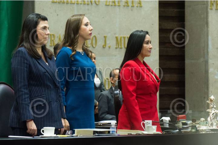Las vicepresidentas de la mesa directiva de la Cámara de Diputados: Marcela Guerra; Noemí Berenice Luna, y Karla Yuritzi Almazán, durante el minuto de silencio por el fallecimiento de migrantes en un centro del Instituto Nacional de Migración en Ciudad Juárez, Chihuahua.