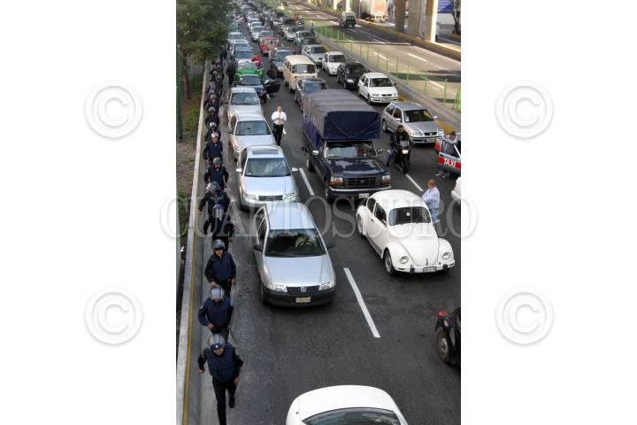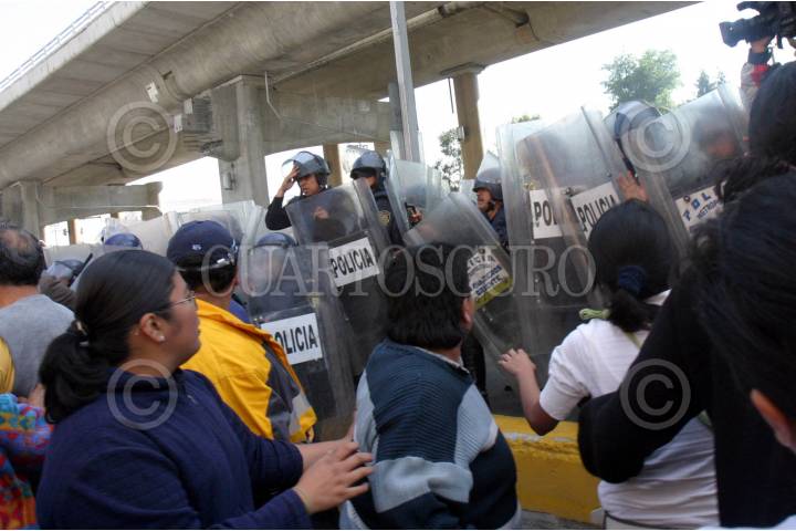 MÉXICO, D.F. 16MARZO2007.- Granaderos desalojan a vecinos de la colonia Santa Maria Nonoalco que bloquearon por algunos minutos el periferico debido a un improvisado puente peatonal donde esta mañana cayeron sobre el arrollo vehicular dos jovenes quedando lesionados. FOTO: PEDRO MARRUFO/CUARTOSCURO.COM