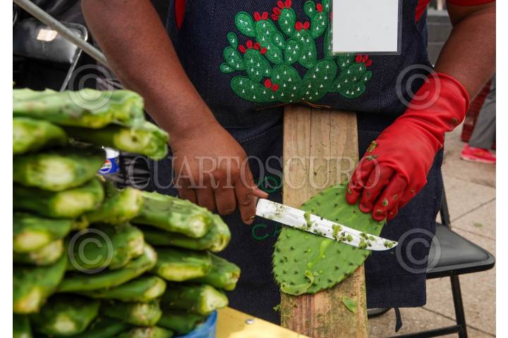 CIUDAD DE MEXICO, 08JUNIO2025.- Agricultor quita las espinas y retira la piel externa de un Nopal durante la Feria del Nopal realizada en Monumento a la Revolución. El Gobierno de la Ciudad de México anunció que cada tres mes se realizará la Feria del Nopal en Monumento a la Revolución para que los productores sean quien lo comercializan y difundan sus beneficios. FOTO: MAGDALENA MONTIEL/CUARTOSCURO.COM
