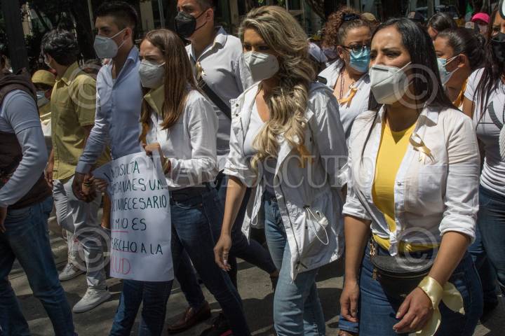 Nora Arias, dirigente capitalina del PRD y Sandra Cuevas, alcaldesa electa de Cuauhtémoc, durante la marcha #QuímiosSí.