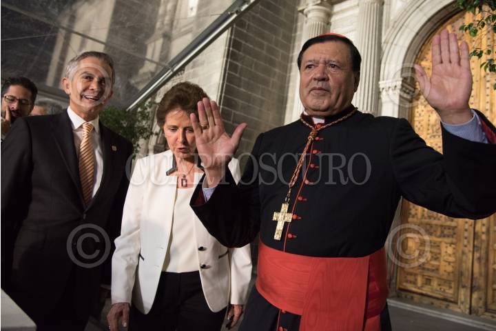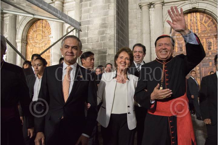 CIUDAD DE MÉXICO, 21JUNIO2017.- Miguel Ángel Mancera Espinosa, jefe de gobierno, MAría Cristina García Cepeda, secretaria de culltura, y Norberto Rivera, cardenal de la iglesía católica, encabezaron el encendido de la Catedral metropólitana, como parte de una campaña de embellecimiento a la ciudad. FOTO: TERCERO DÍAZ /CUARTOSCURO.COM