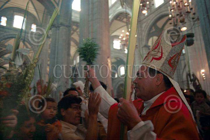 En domingo de Ramos se bendicen en todas las iglesias las palmas que se colocan en las puertas de ingreso a una casa, como recordatorio de un compromiso con Jesucristo; Norberto Rivera Carrera , Arzobispo de México, bendijo los ramos durante la misa en la Catedral metropolitana. FOTO: Sandra Perdomo/CUARTOSCURO.COM