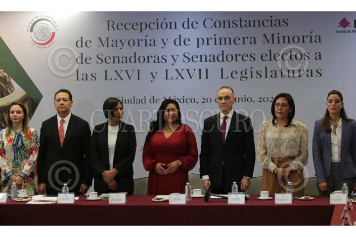 CIUDAD DE MÉXICO, 20JUNIO2024.- Ana Lilia Rivero Rivero, presidenta de la mesa directiva del Senado de la República, acompañada Arturo Garita Alonso, secretario de Servicios Parlamentarios; Mauricio Farah Gebara, especialista en Derechos Humanos, y de los Consejeros Electorales Carla Astrid Humphrey Jordan, Beatriz Claudia Zavala Pérez y Dania Paola Ravel Cuevas, y Norma Irene de la Cruz Magaña durante la entrega de constancias de mayoría y de primera minoría de senadores a la LXVI y LXVII Legislatura del Proceso Electoral 2023-2024. La cita es en el Senado de la República FOTO: CUARTOSCURO.COM