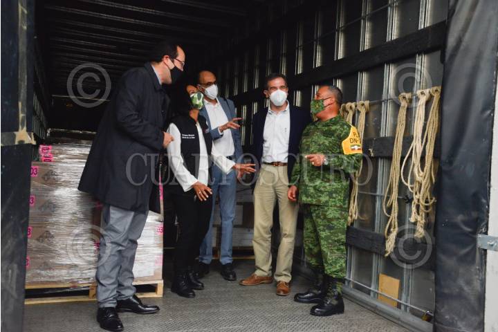 Los consejeros electorales: Ciro Murayama; Norma Irene de la Cruz; Martín Faz Mora; Lorenzo Córdova; y el general César Augusto Bonilla Orozco, durante el inicio de la distribución de las 102 millones de boletas electorales y material de casillas para los comicios del próximo 6 de junio.