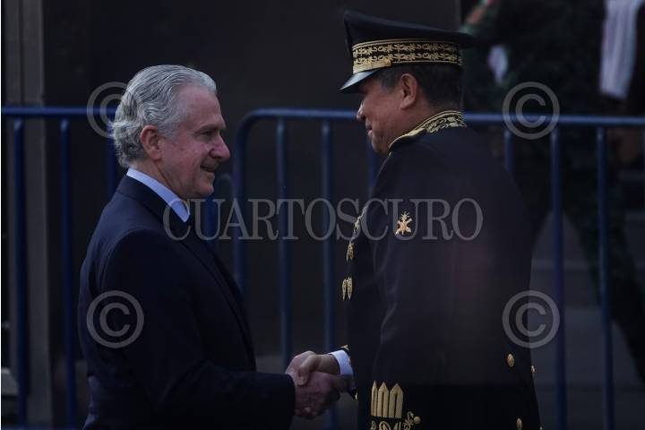 Santiago Creel saluda a Luis Cresencio Sandoval previo a la representación de la Marcha de la Lealtad sobre avenida Juárez.