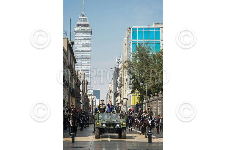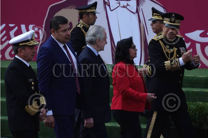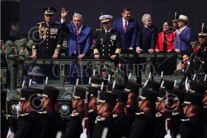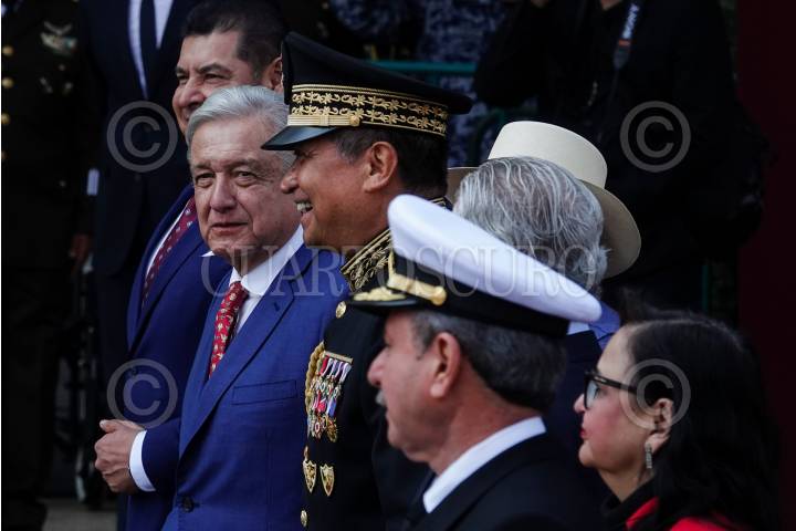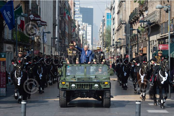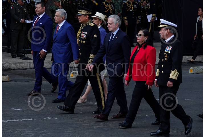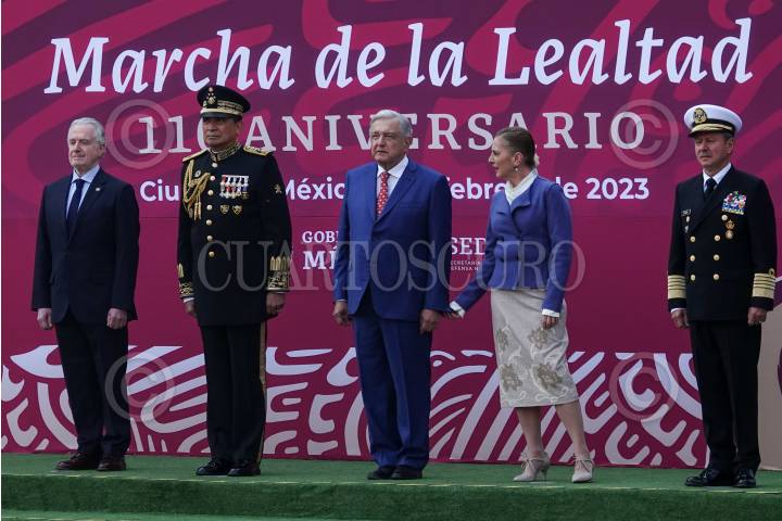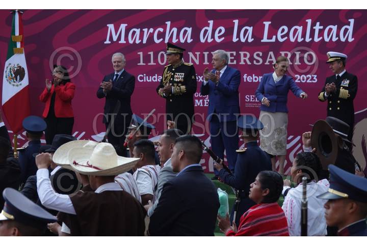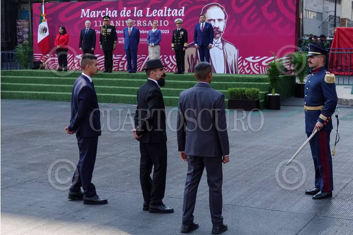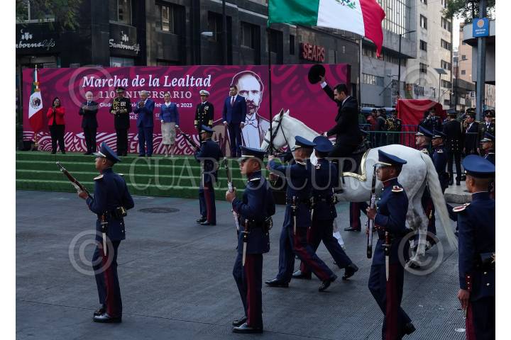 Alejandro Armenta Mier; Andrés Manuel López Obrador; Beatriz Gutiérrez Müller; Luis Cresencio Sandoval; Santiago Creel; Norma Lucía Piña y Rafael Ojeda presiden la representación de la Marcha de la Lealtad sobre avenida Juárez.