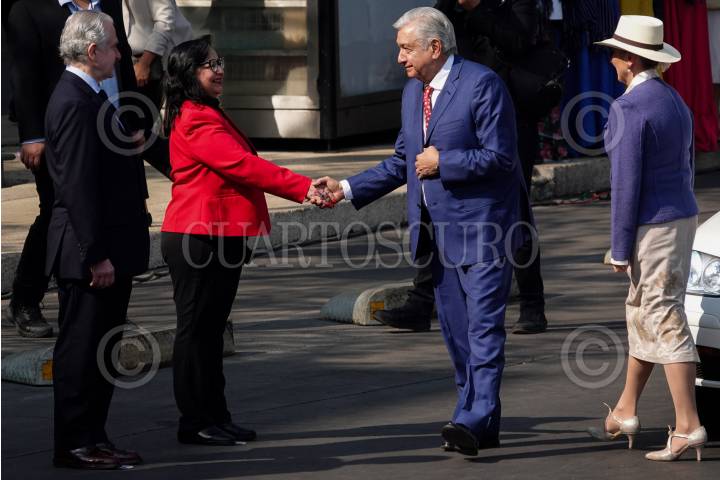 Andrés Manuel López Obrador y Beatríz Gutiérrez Müller saludan a Norma Lucía Piña previo a la representación de la Marcha de la Lealtad sobre avenida Juárez.