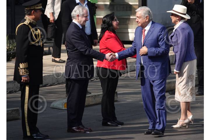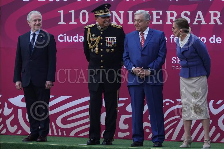 Santiago Creel; Luis Cresencio Sandoval; Andrés Manuel López Obrador y Beatriz Gutiérrez Müller; durante la representación de la Marcha de la Lealtad sobre avenida Juárez.