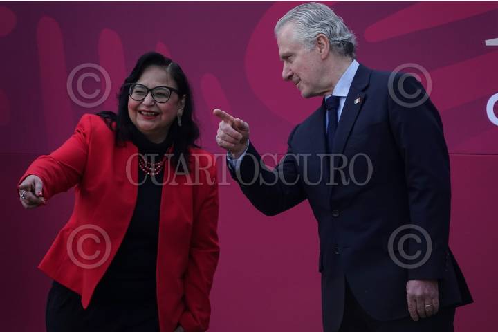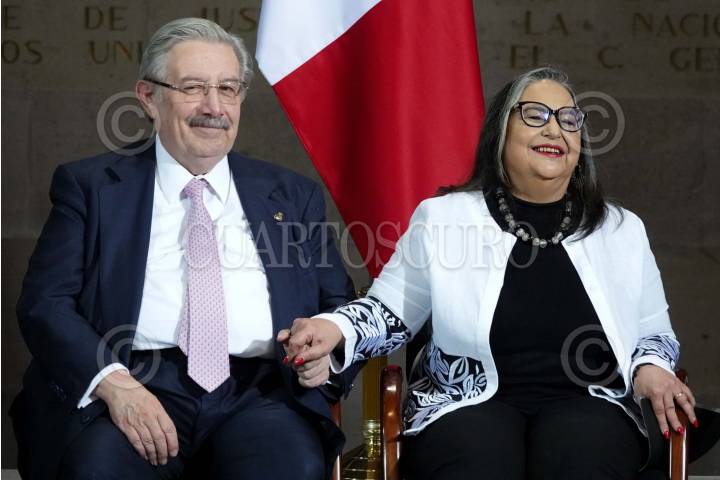 TOLUCA, ESTADO DE MÉXICO, 11AGOSTO2025.- Hugo Aguilar Ortiz Ministro Presidente electo de la SCJN y Norma Lucia Piña Hernández, Ministra Presidenta de la Suprema Corte de Justicia de la Nación durante la Primera Sesión Extraordinaria de la Sala de Asuntos Indígenas del Tribunal Superior de Justicia del Estado de México que se realizó en el Patio Constitución del Palacio del Poder Judicial del Edoméx. FOTO: CRISANTA ESPINOSA AGUILAR/CUARTOSCURO.COM