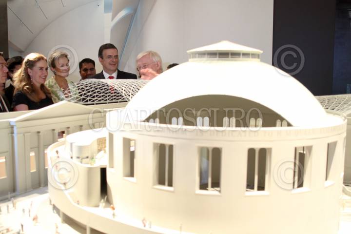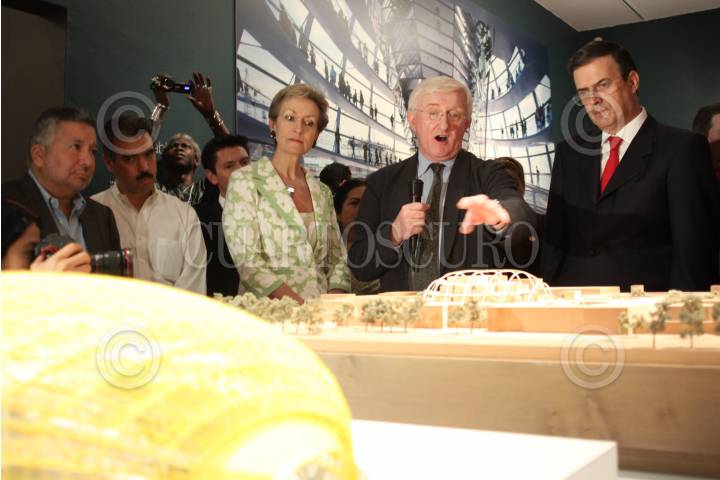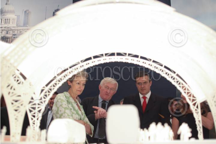MÉXICO, D.F., 21MAYO2010.- Judith McGregor, embajador del Reino Unido, Spencer de Grey y Marcelo Ebrard Casaubón, Jefe de Gobierno, recorrieron la exposición arquitectónico Norman Foster + Partners, en el Museo en San Ildefonso. La muestra es una cronología de 227 proyectos que el despacho ha realizado: planos, dibujos, maquetas, fotografía de gran formato y vídeo. FOTO: MOISÉS PABLO/CUARTOSCURO.COM
