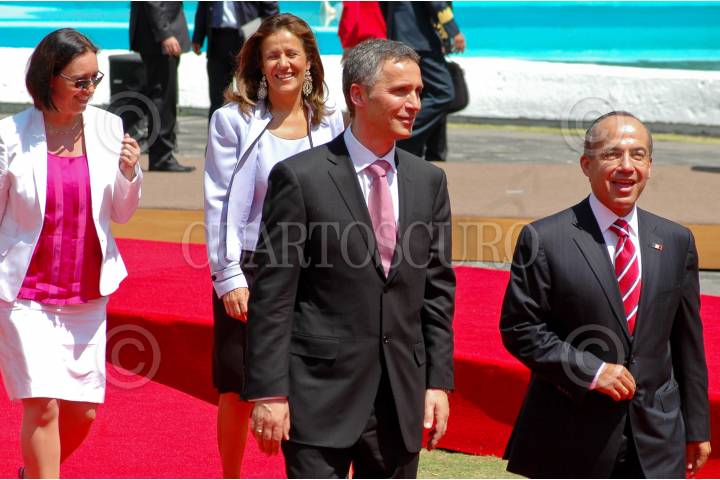 MÉXICO, D.F., 09ABRIL2010.- El presidente Felipe Calderón acompañado del primer ministro de Noruega Jens Stoltenberg y sus respectivas esposas Margarita Zevala e Ingrid Schulerud al termino del evento de bienvenida que se celebro en la explanada del monumento a Francisco I. Madero de la residencia oficial de Los Pinos. FOTO: RODOLFO ANGULO/CUARTOSCURO.COM